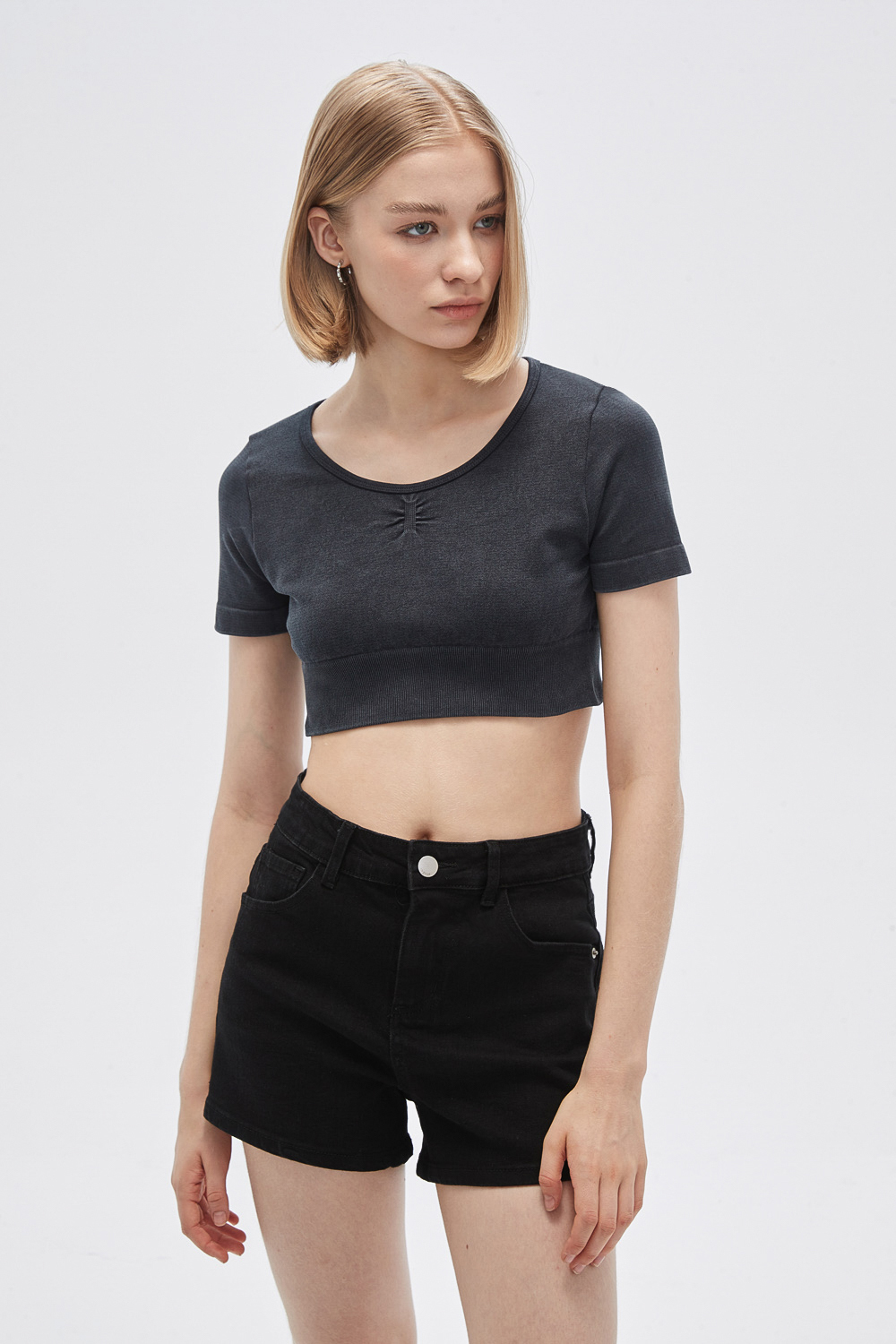 Tops cropped manga corta de poliamida, wash, al cuerpo y cuello redondo