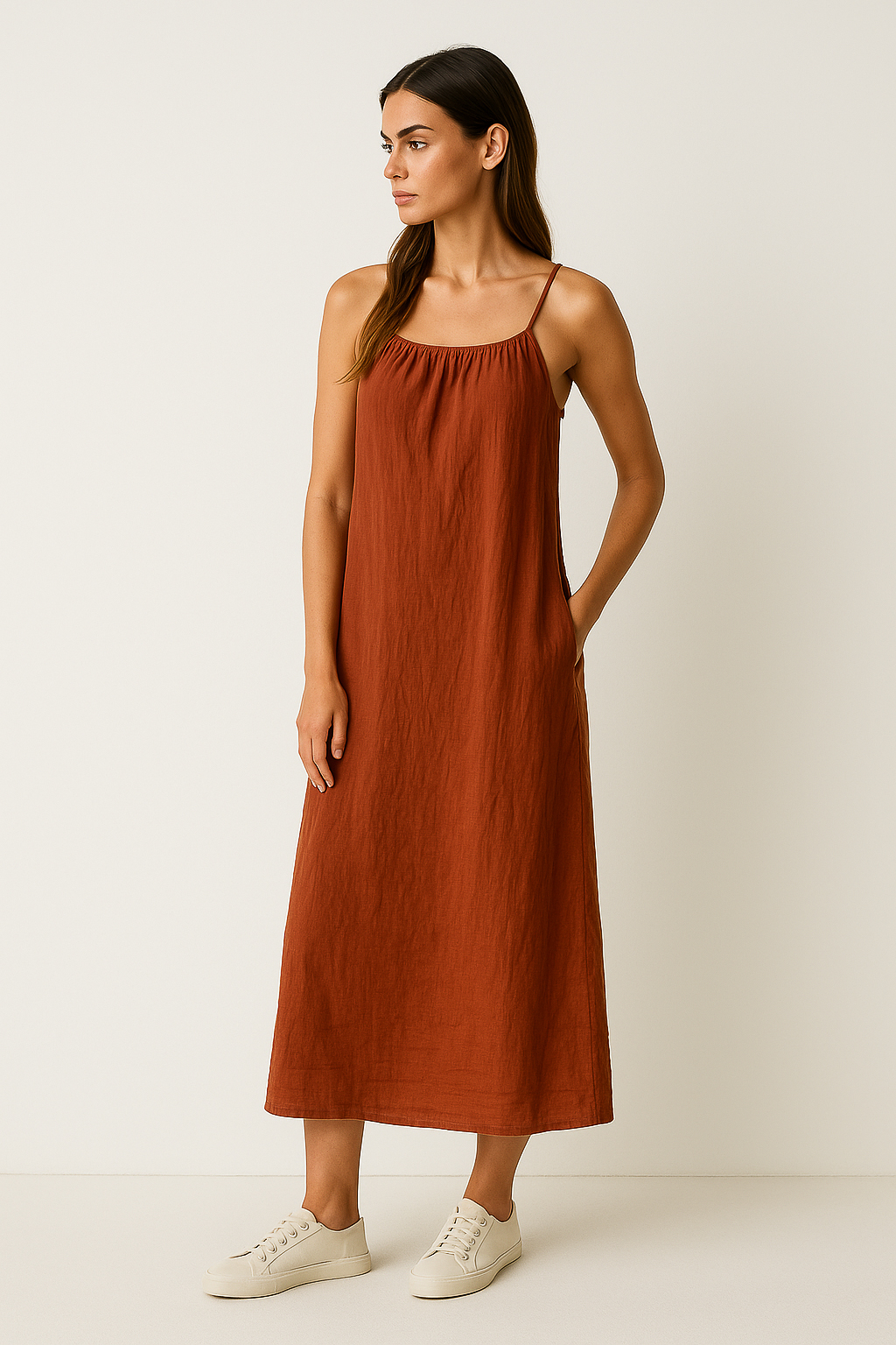Vestido sin mangas, ancho, con reguladores y cuello redondo