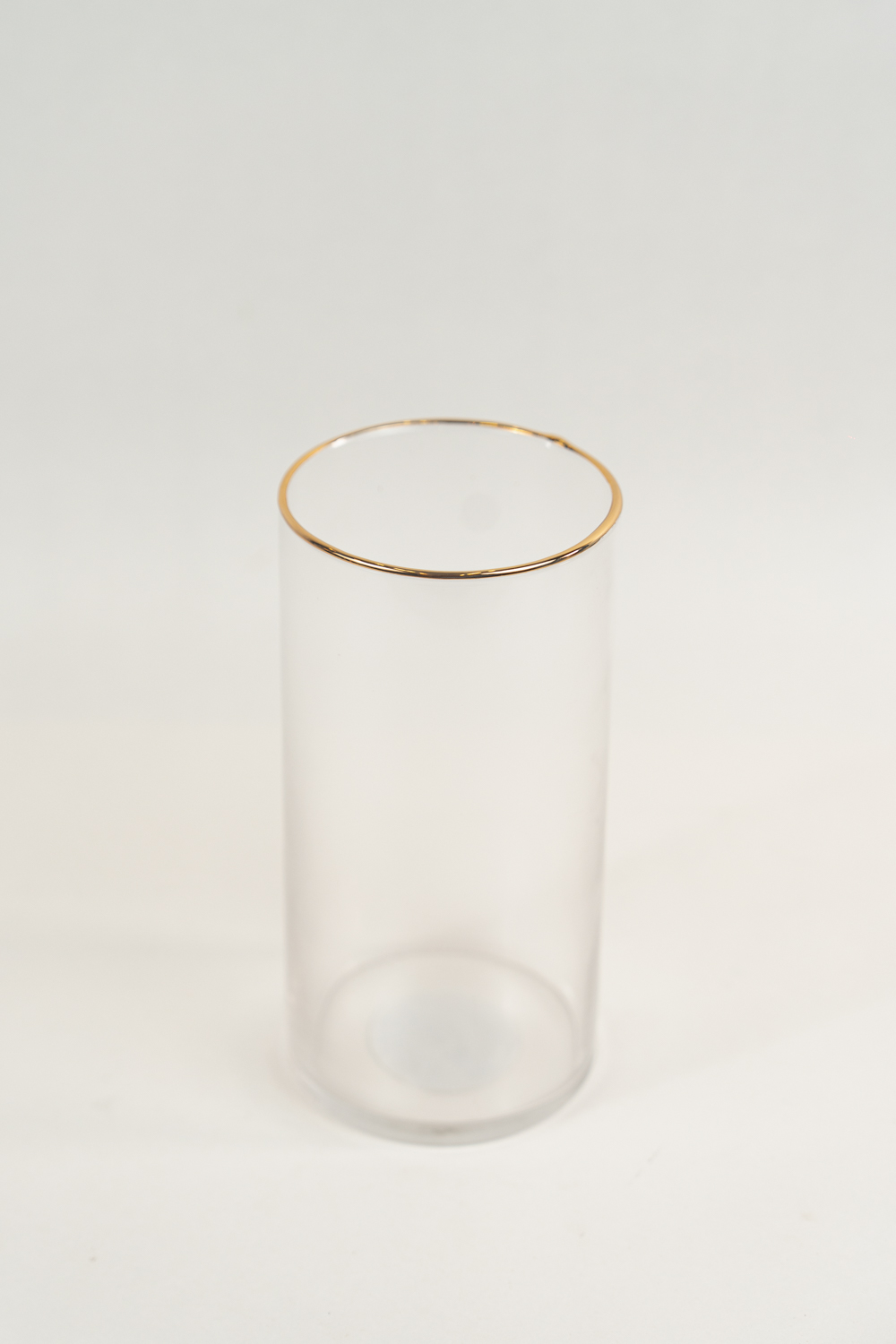 Florero Rosin Borde dorado de vidrio. Alto: 20 cm. Diámetro 10 cm.