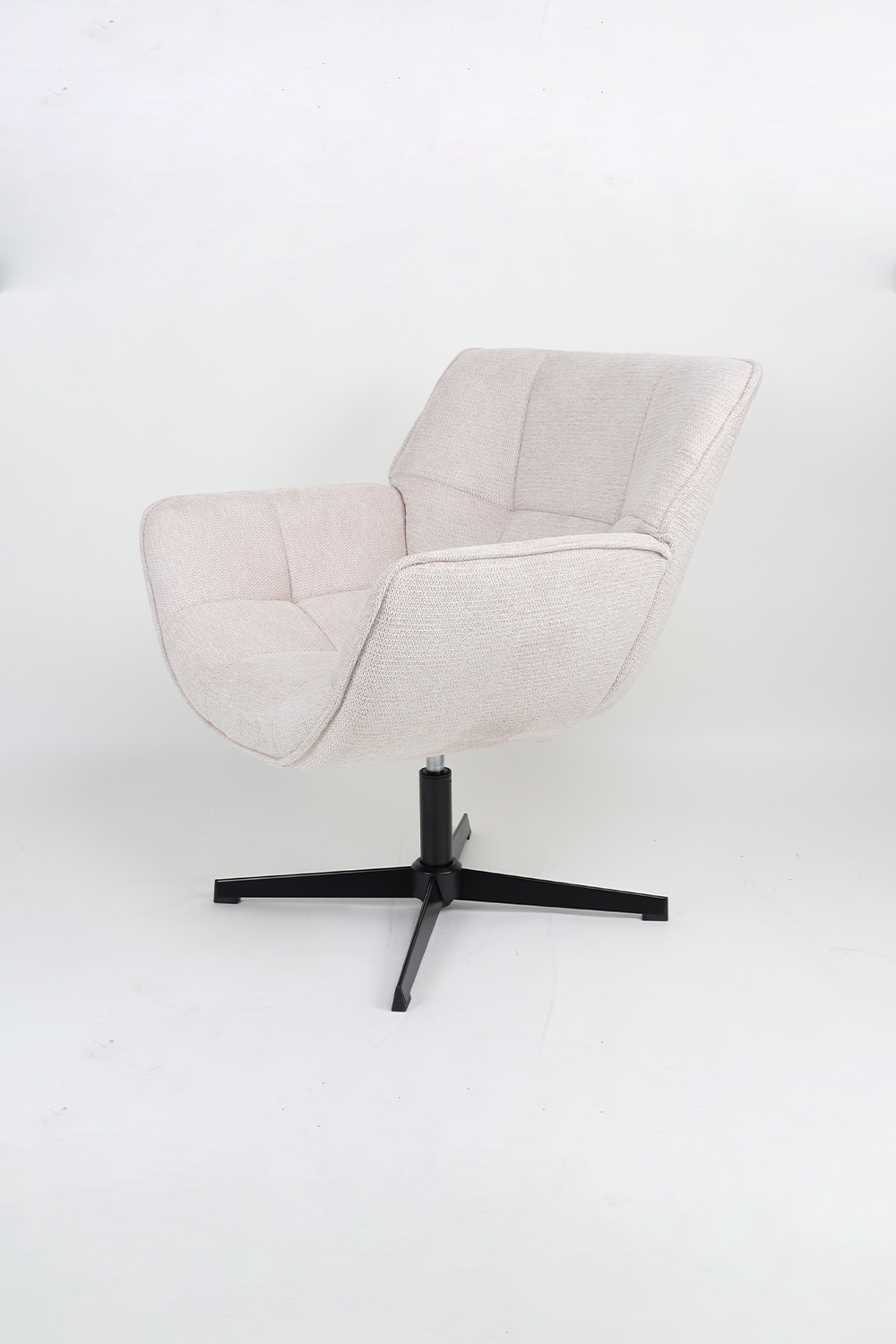 Butaca con base Giratoria Adele. Relleno: Espuma de alta densidad. Estructura: madera contrachapada y acero. Tela: 100% Poliéster. Medidas: 73*75*87cm.