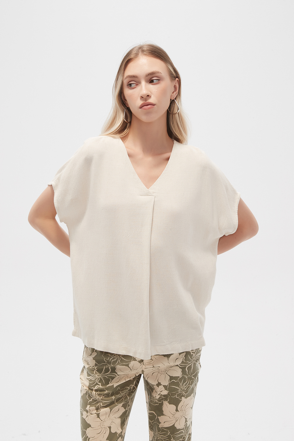 Blusa lino, estampado, holgado y cuello en v