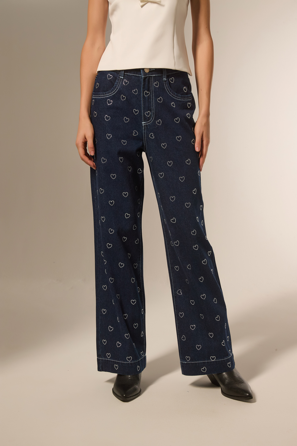 Pantalon jean, strass, ancho y de calce alto
