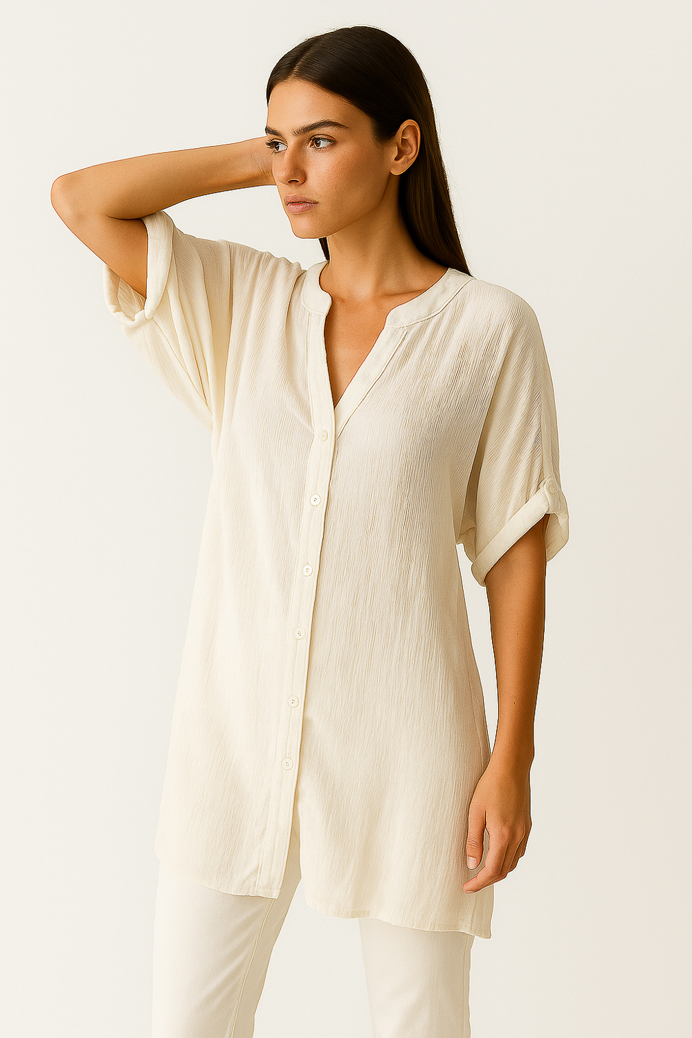 Tunica algodon, holgado, con botones, con lazo y cuello profundo