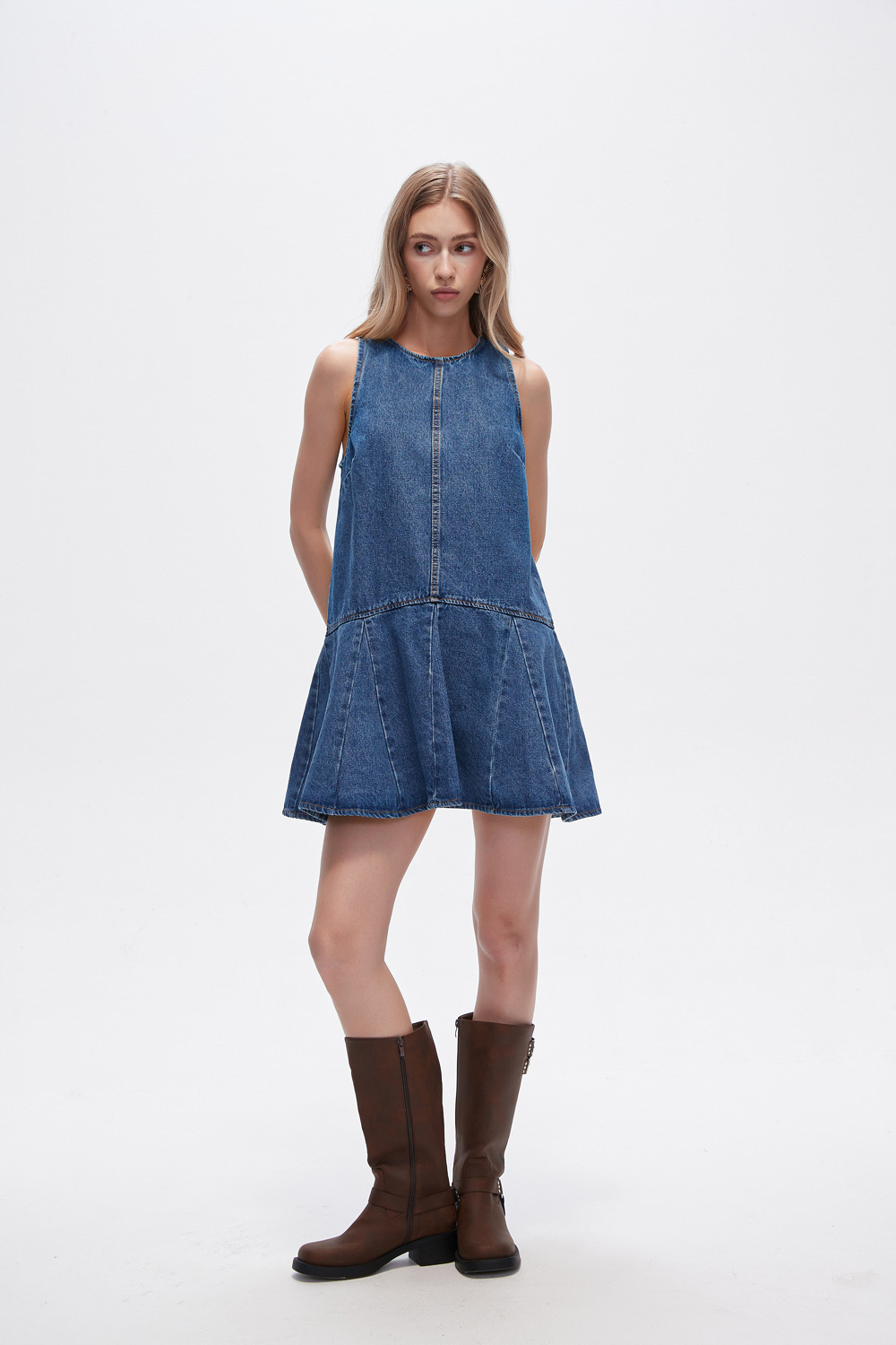 Vestido bretel ancho de algodon, wash, volados, relaxed, con cierre y cuello a la base