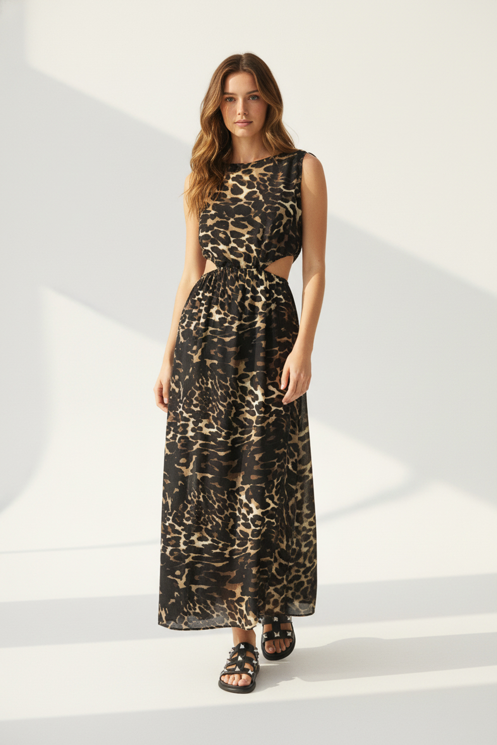 Vestido sin mangas de poliester, aop, anudado, recto, con borla, con elastico y cuello bote