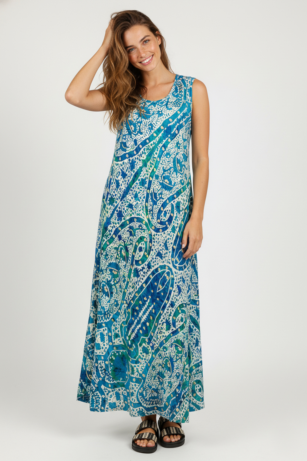 Vestido sin mangas de poliester, aop, abertura, ancho y cuello redondo