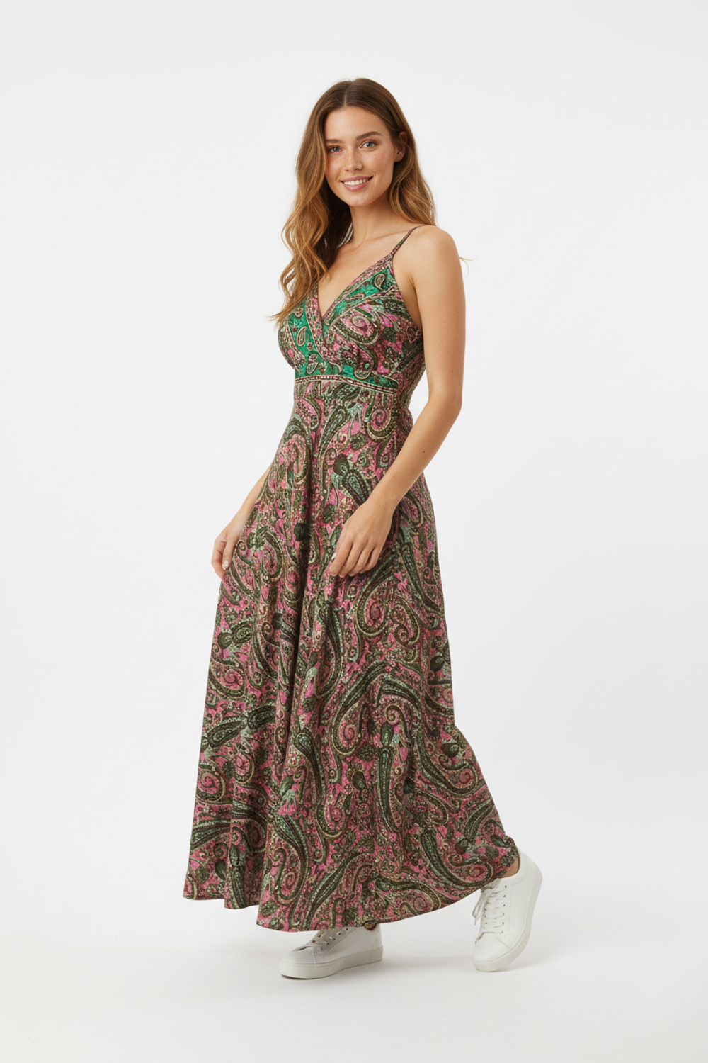 Vestido largo de poliester, aop, punto smock, holgado y cuello en v