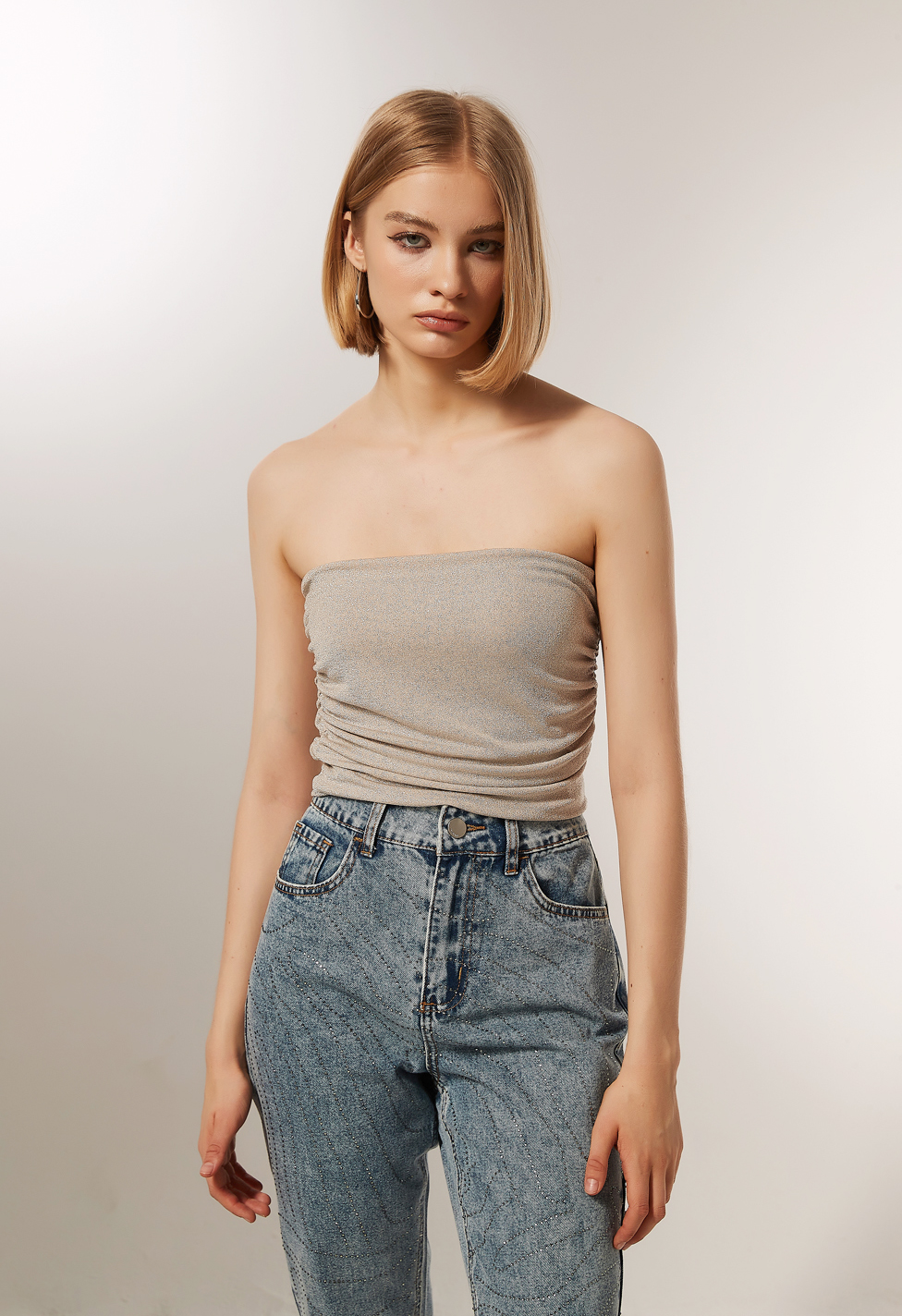 Tops viscosa, frunces, lurex, al cuerpo, con elastico y cuello strapless