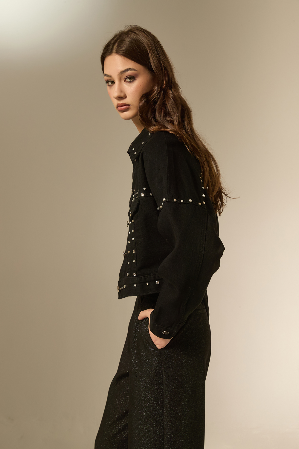 Chaqueta jean, strass, holgado, con botones, con tachas y cuello camisa