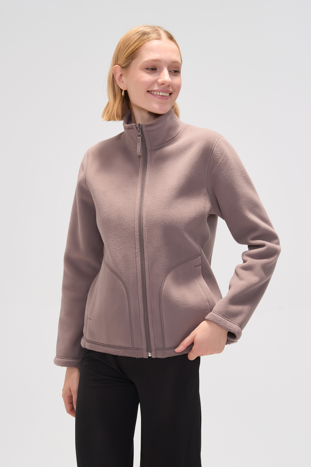 Campera manga larga, bolsillos y corderito