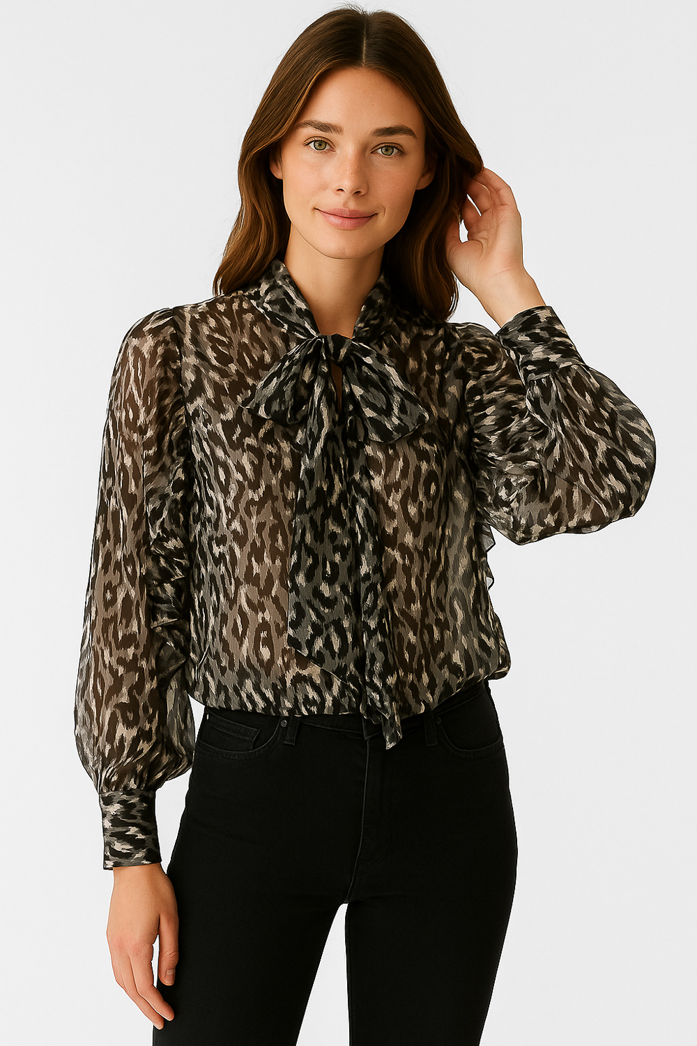 Blusa poliester, aop, con cordon y cuello a la base