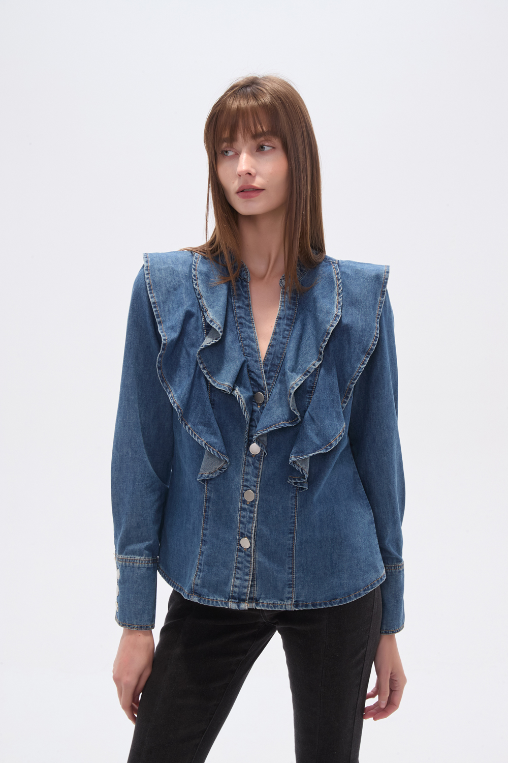 Camisa jean, volados, con botones y cuello en v