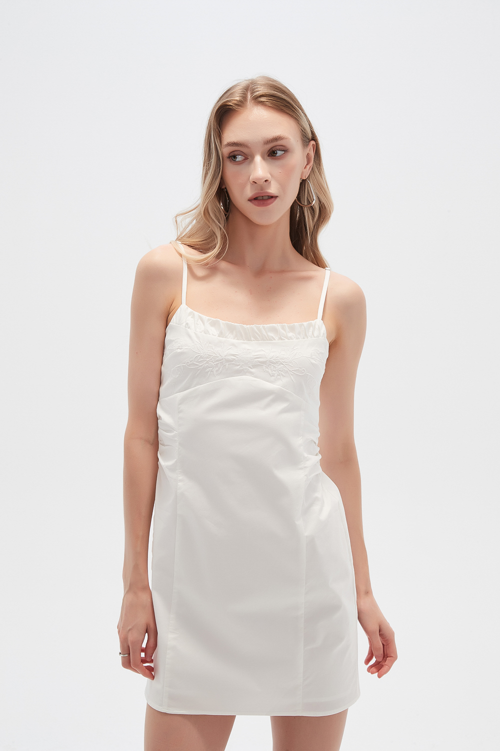 Vestido bretel fino de algodon, broderie, con cierre y cuello redondo
