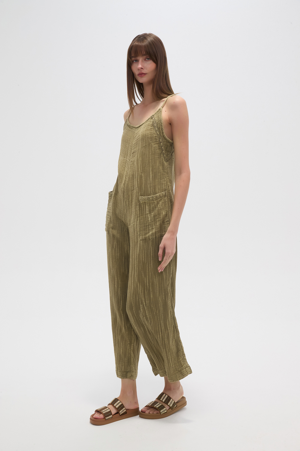 Mono bretel lencero de algodon, bolsillos, holgado, con cordon y cuello en v