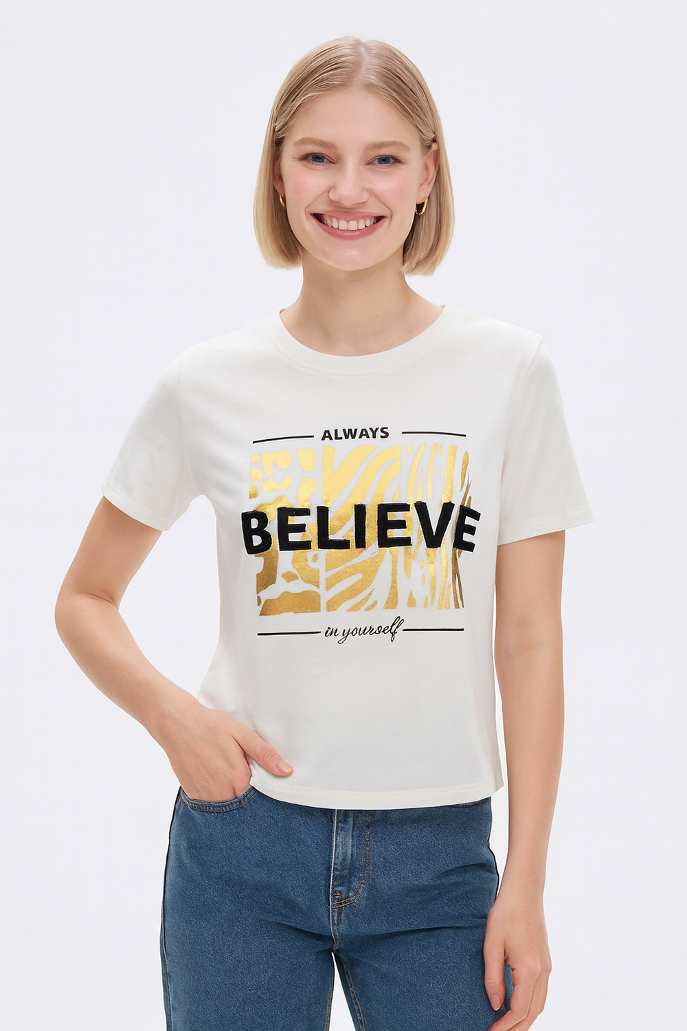 Remera manga corta de viscosa + elastano, recurso foil, estampado, holgado y cuello a la base