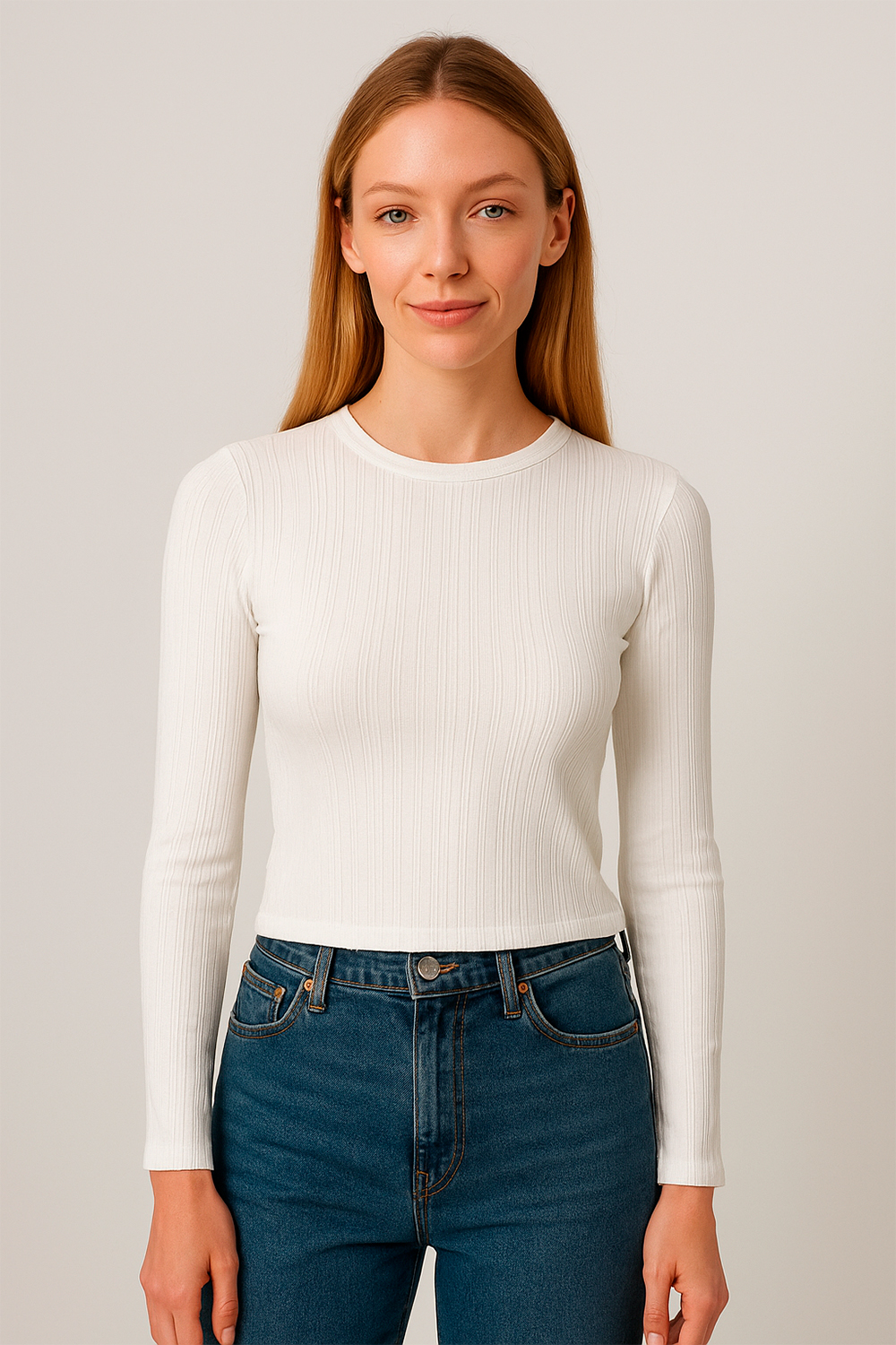 Remera manga larga de algodon, canalé, al cuerpo y cuello a la base