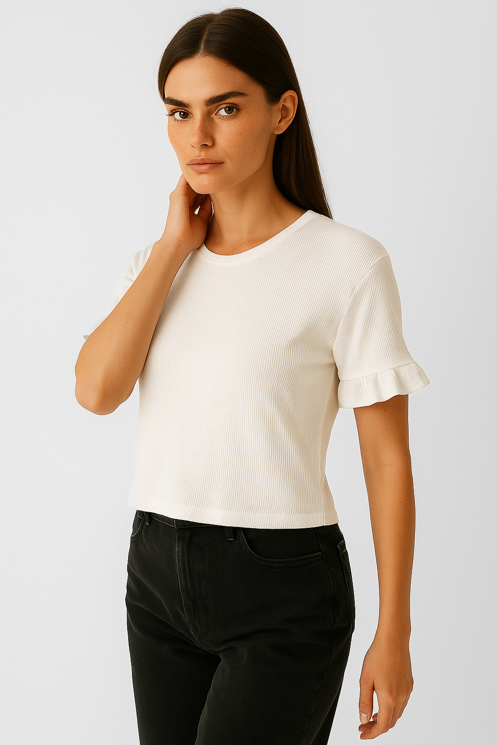Remera manga corta de viscosa, volados, al cuerpo y cuello redondo